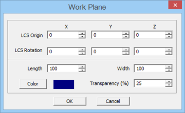 In all the three cases above, a translucent plane appears showing the location and orientation of the new work plane. The transverse axes (local X and Y axes) of the new work plane are displayed in red and green colors, respectively. A new "User Coordinate System (UCS)" is established on the new work plane. In the Work Plane Dialog, you can see the world coordinates of the center of the UCS and its rotation angles with respect to the project's world coordinate system (WCS). From this dialog you can change both the center coordinates and the rotation angles. This will change the location and orientation of the new arbitrary work plane. Once you are content with the location and orientation of the new work plane, you can also change its visible size. Note that the visible size of the work plane is purely for visualization purposes; otherwise, the work plane has infinite extents. You can change both Length and Width of the work plane separately. You can also change the Color and Transparency level of the work plane.