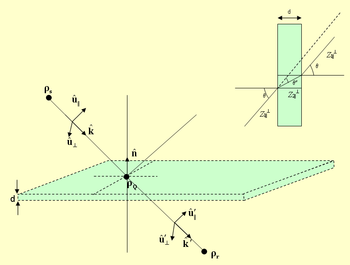 - [math] T_{\|} = \frac{(1-{\Gamma_{\|}}^2) \exp(-jk_2 d (\mathbf{ \hat{k}'' \cdot \hat{n}}))} { 1-{\Gamma_{\|}}^2 \exp( -2jk_2 d (\mathbf{ \hat{k}'' \cdot \hat{n} }) ) } [/math]