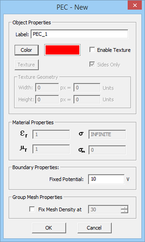 To add a new Fixed-Potential PEC group to a project, right-click on "Fixed-Potential PEC Objects" on the Navigation Tree, and select "Insert New PEC..." From the PEC dialog, you can change the default red color and set a value for the "Voltage" in Volts.