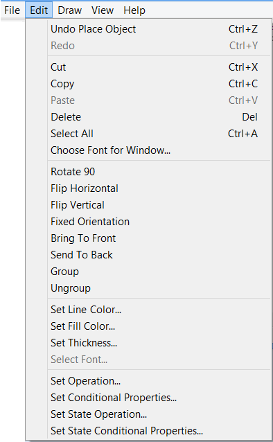 You can change the color of your lines and the boundaries of your objects from the default black. To do so, select one or more objects. Then select "Set Line Color..." from Symbol Editor's Edit Menu. This opens the color palette, where you can choose any desired color for your selected objects. You can set the thickness of the lines and object borders. By default, the line thickness is one point. To change an object's line thickness, first select the object and then select "Set Thickness..." from Symbol Editor's Edit Menu. Enter the desired value for the line thickness in the Thickness dialog. You can fill in rectangle, ellipse and polygon objects with any color. To fill in a object, first select it and then select "Set Fill Color..." from Symbol Editor's Edit Menu. This opens the same color palette, where you can choose your fill color. Symbol Editor's Edit Menu gives you more options to change or tailor your drawing. Some of these additional tools include rotating objects by 90 degrees, flipping horizontally or vertically, bringing objects to "Front" or sending them "Back" or grouping and ungrouping objects.