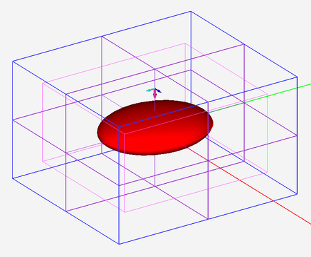 The FDTD computational domain must be discretized using an appropriate meshing scheme. EM.Tempo uses a non-uniform, variable, staircase (pixelated) Yee mesh with a mesh density that you can customize. A fixed-cell mesh generator is also available, where you can set constant cell dimensions along the three principal axes for the entire computational domain. The variable mesh density is specified in terms of the effective wavelength inside material media. As a result, the mesh resolution and average mesh cell size differ in regions that are filled with different types of material. EM.Cube's non-uniform mesher generates more cells in the areas that are occupied by dielectric materials, fewer cells in the free space regions and no cells inside (impenetrable) PEC regions. FDTD Module's default "adaptive" mesh generator also refines the mesh around curved segments of lines, surface or solids to produce a far more accurate representation of your geometry. The example on the right illustrates a metal ellipsoid and a 3D view of its Yee mesh.