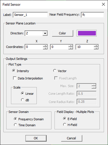 • Field Sensor for monitoring E- and H-field components on a cross section of the computational domain in both time and frequency domains.