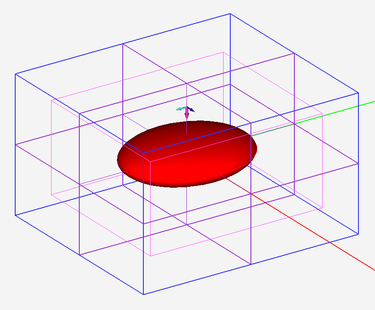 The FDTD computational domain must be discretized using an appropriate meshing scheme. EM.Tempo uses a non-uniform, variable, staircase (pixelated) Yee mesh with a mesh density that you can customize. A fixed-cell mesh generator is also available, where you can set constant cell dimensions along the three principal axes for the entire computational domain. The variable mesh density is specified in terms of the effective wavelength inside material media. As a result, the mesh resolution and average mesh cell size differ in regions that are filled with different types of material. EM.Tempo's non-uniform mesher generates more cells in the areas that are occupied by dielectric materials, fewer cells in the free-space regions and no cells inside (impenetrable) PEC regions. EM.Tempo's default "adaptive" mesh generator also refines the mesh around curved segments of lines, surface or solids to produce a far more accurate representation of your geometry. The example on the right illustrates a metal ellipsoid and a 3D view of its Yee mesh.