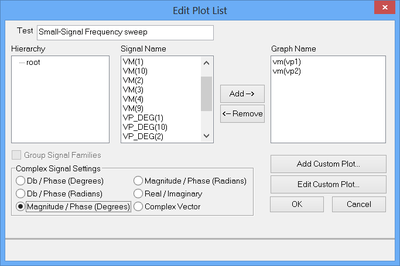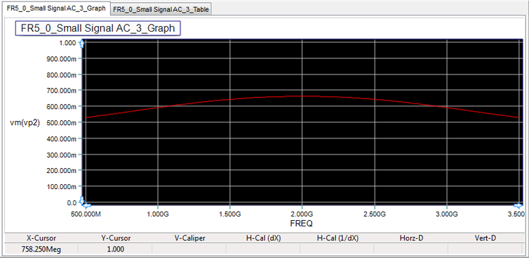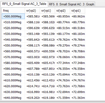 After the completion of the AC sweep, you should get a voltage graph and data table similar to the ones shown below. Note from the real/imag parts table that the two input voltages are equal.