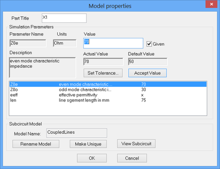 In the analysis of coupled transmission lines, it is customary to decompose signals as the superposition of two orthogonal modes: the even and odd modes. In this part of the tutorial lesson, you will excite each of these modes. Set the values of the even and odd mode impedances of the coupled lines to Z0e = 70Ω and Z0o = 30Ω, respectively. Set the length of the lines to len = 37.5mm, which is a quarter wavelength at 2GHz assuming TEM lines (eeff = 1).