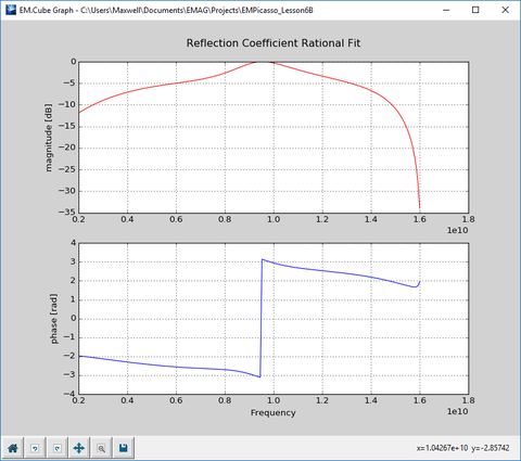 After the completion of the frequency sweep, open the data manager and plot the data files "REFLECTION_RationalFit.CPX" and "TRANSMISSION_RationalFit.CPX" in EM.Grid. The figures below show the computed reflection and transmission coefficients as a function of frequency for normal plane wave incidence with a TEz polarization.