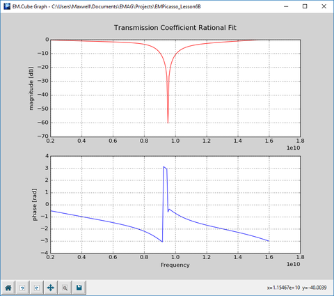 At the end of the frequency sweep, plot the data files "REFLECTION_RationalFit.CPX" and "TRANSMISSION_RationalFit.CPX" in EM.Grid and note how much the frequency response changes with the angle of incidence.
